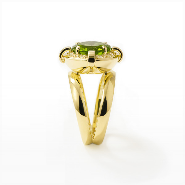Bohatě pojatý prsten ze žlutého zlata tvoří výrazná silueta s elegantní dvojitou šínou. Centrální peridot v kulatém briliantovém brusu doplňují jemné brilianty, které zvýrazňují jeho přirozený zelený odstín.