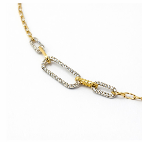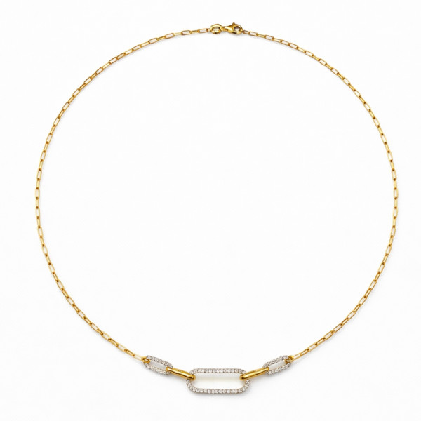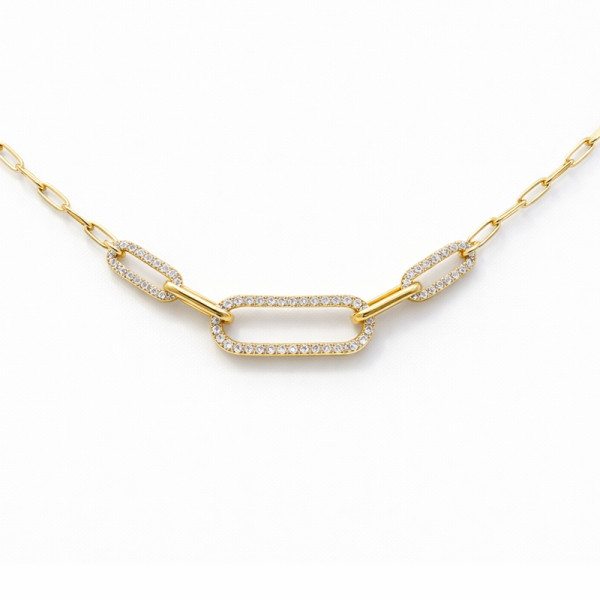 Přívěsek je složen ze tří oválných článků osazených brilianty, které plynule navazují na zlatý řetízek. Řetízek je pevnou součástí šperku a nelze jej měnit.