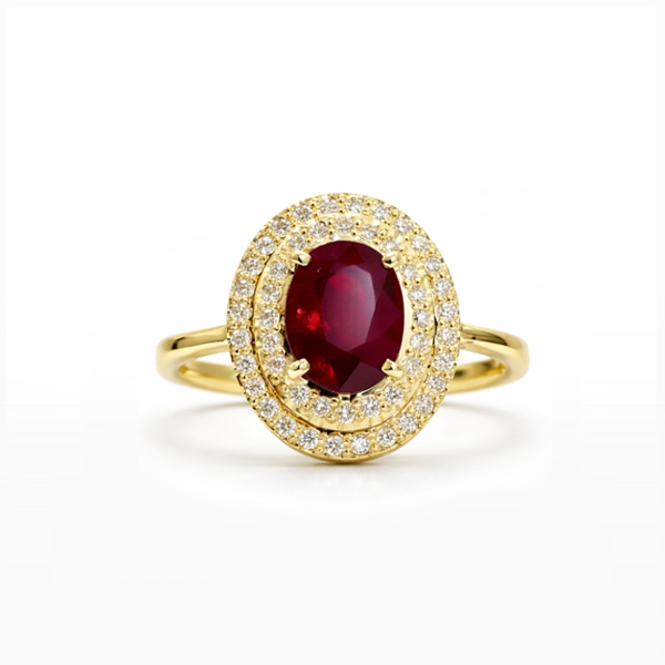 Prsten ze žlutého zlata je osazen oválným přírodním rubínem o hmotnosti 1,95 ct, který doplňuje dvojitá halo obruba z briliantů. Konstrukce šperku zvýrazňuje centrální kámen, zatímco jemně profilovaná obroučka a přesné osazení kamenů podtrhují jeho reprezentativní a technicky čisté zpracování.